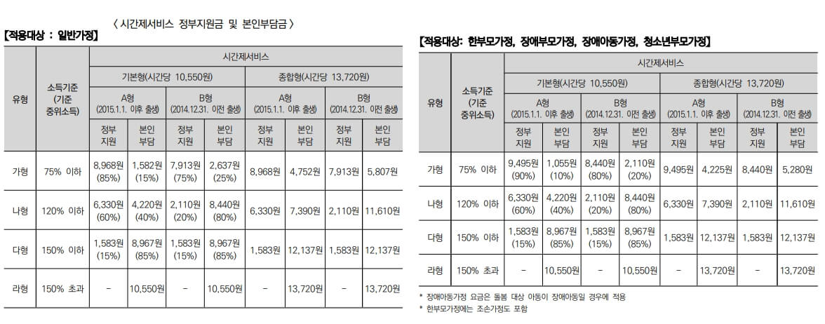소득수준에 따라 가~라형으로 나뉘는데 가~다형은 가구소득이 기준중위소득 150% 이하인 가구로 정부지원금을 받을 수 있는 대상입니다.(가형이 가장 많은 정부지원금을 받습니다)