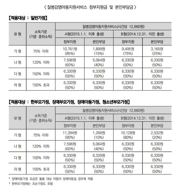 유치원, 초등학교, 보육시설 등의 시설을 이용하고 있는 아동이 전염성 질병 감염으로 가정양육이 필요할 때 아동의 병원 동행과 재가 돌봄서비스 제공(시간당 12,660원)