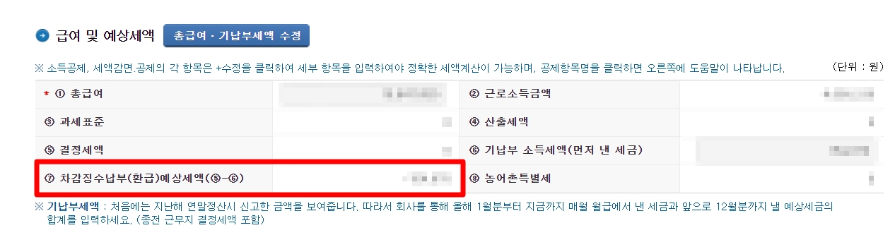 6. 급여 및 예상세액에 '⑦차감징수납부 예상세액' 부분이 납부해야 되는 예상세액입니다. 마이너스로 나오면 환급을 받는 것이고 플러스로 나오면 추가 납부를 해야 합니다.